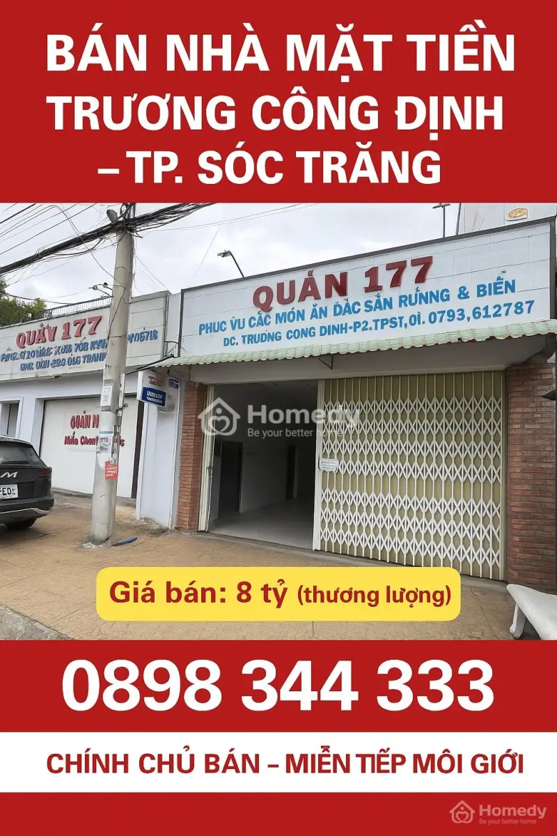 📍 Địa chỉ: Đường Trương Công Định, phường Phú Lợi, TP 📍 Địa chỉ: Đường Trương Công Định, phường Phú Lợi, TP Sóc Trăng 📏 Diện tích: 330m² (3 căn liền kề, tổng mặt tiền 11m) 🏗️ Kết cấu: Nhà cấp 4 kiên cố, nền cao sạch cải tạo 🧭 Hướng: Đông Bắc 🧾 Pháp lý: Sổ hồng căn, đất thổ cư 100%, sang ngay 🏡 Hiện trạng: Nhà trống, thể dọn kinh doanh ngay 💰 Giá bán: 8 tỷ (thương lượng trực tiếp chính chủ) 📞 Liên hệ: 0898 344 *** – CHÍNH CHỦ BÁN, MIỄN TIẾP MÔI GIỚI ✨ ĐẶC ĐIỂM NỔI BẬT: ✅ Mặt tiền đường Trương Công Định, trung tâm sầm uất, giao thông thuận lợi ✅ Gần chợ Khánh Hùng, cầu Đen, trường Tiểu học Trương Công Định ✅ Thích hợp quán showroom, văn phòng, ngân hàng cho thuê sinh lời ✅ Khu dân cư đông đúc, an ninh ngập nước 🏪 TIỆN ÍCH XUNG QUANH: Gần trung tâm hành chính, ngân hàng, siêu thị, trường học, bệnh viện Đường xe hơi thuận tiện, khu dân trí cao Mặt bằng rộng hiếm khu trung tâm TP Sóc Trăng 🔑 Lợi đầu tư: Mặt tiền rộng 11m – vị trí đắc địa, hiếm có Sổ hồng pháp lý ràng Giá bán hợp lý tiềm năng phát triển khu vực