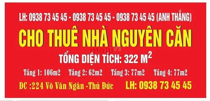 Nhà nguyên căn cho thuê số 224 Võ Văn Ngân, Phường Bình Thọ, Thủ Đức, Hồ Chí Minh diện tích 322m², cấu trúc 4 tầng, Bất động sản mặt tiền trung tâm TP Thủ Đức, Mua bán đông đúc, nhộn nhịp, phù hợp cho kinh doanh, mua bán làm văn phòng công ty cho các tập đoàn, nhãn hàng : Ngân hàng, giới di động, fpt shop,Viettel, vnpt, an phước, kfc, jollibe, lotteria, adidas, DIỆN TÍCH : Tầng 1: 106 m² (4 x 26) Tầng 2: 62 m² Tầng 3: 77 m² Tầng 4: 77 m² Tiện ích xung quanh : Đầy các ngân hàng, Vincom Thủ Đức, Chung King crow infinity, Nhà Văn Hoá Thiếu Nhi Thủ Đức, Siêu Thị Nguyễn Kim, Thế giới di động, Trường ĐH Sư Phạm Kỹ Thuật, Trường Cao Đẳng Xây Dựng, Trung Tâm Thể Dục Thể Thao, Chợ Bắc Ninh, Chợ Thủ Đức, Làng Đại Học Thủ Đức Liên hệ biết thông tin chi tiết: Anh Thắng